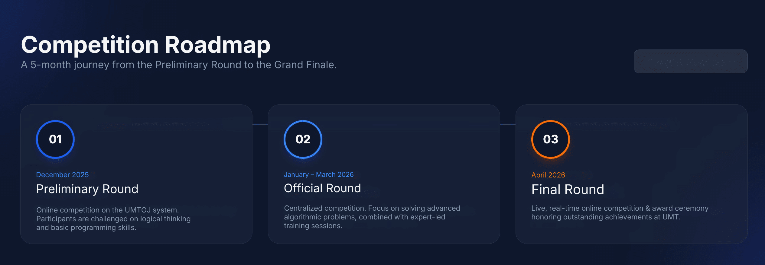 Designed as a professional, transparent, and forward-looking academic platform, UMT TechGen 2026 targets high school students nationwide who are passionate about mathematics, computer science, and information technology. The competition is structured to provide early exposure to algorithmic thinking, programming skills, and problem-solving methodologies in a rigorous academic environment.