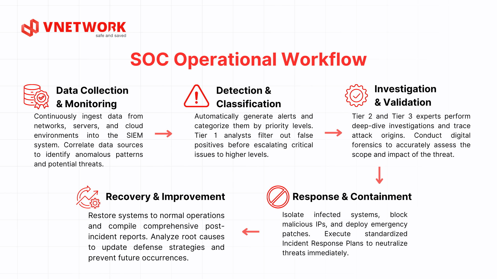 Both VNIS and EG-Platform are operated under the direct oversight of VNETWORK's SOC team, which works continuously around the clock. The SOC team is responsible for monitoring all security events as they arise, triaging and investigating alerts, and executing standardized response procedures when genuine threats are identified.