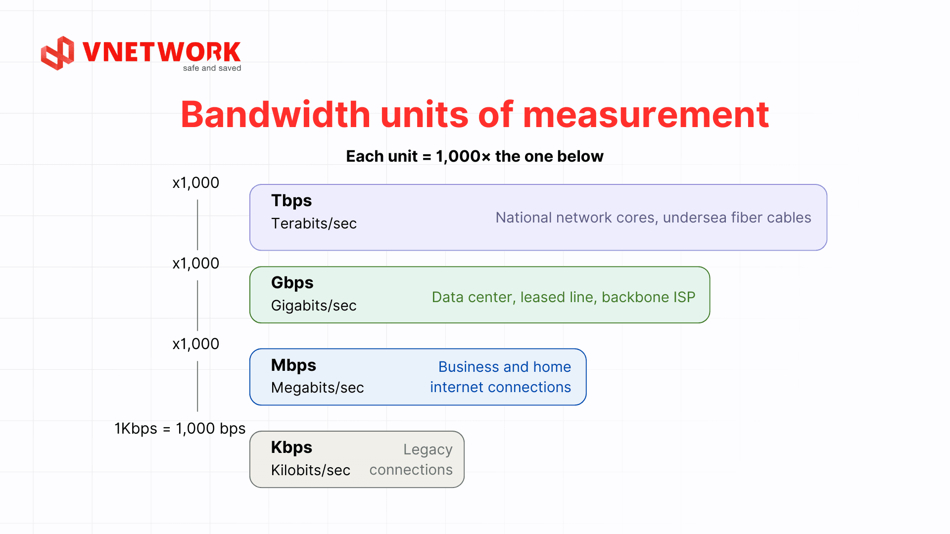 - Gbps (Gigabits per second): equivalent to 1,000 Mbps, used in data center infrastructure, high-tier leased lines, and carrier backbone connections.