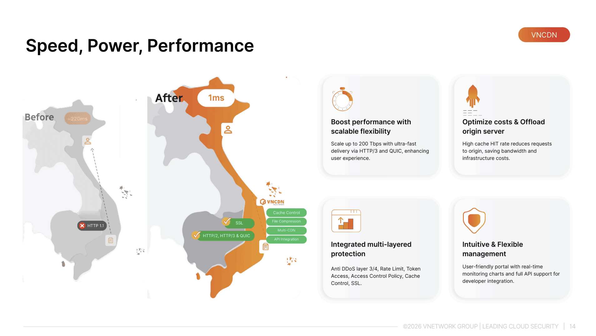For large enterprises with high traffic volumes and strict uptime requirements, VNETWORK provides VNCDN, a content delivery network solution optimized specifically for the Vietnamese market and the Asia region.