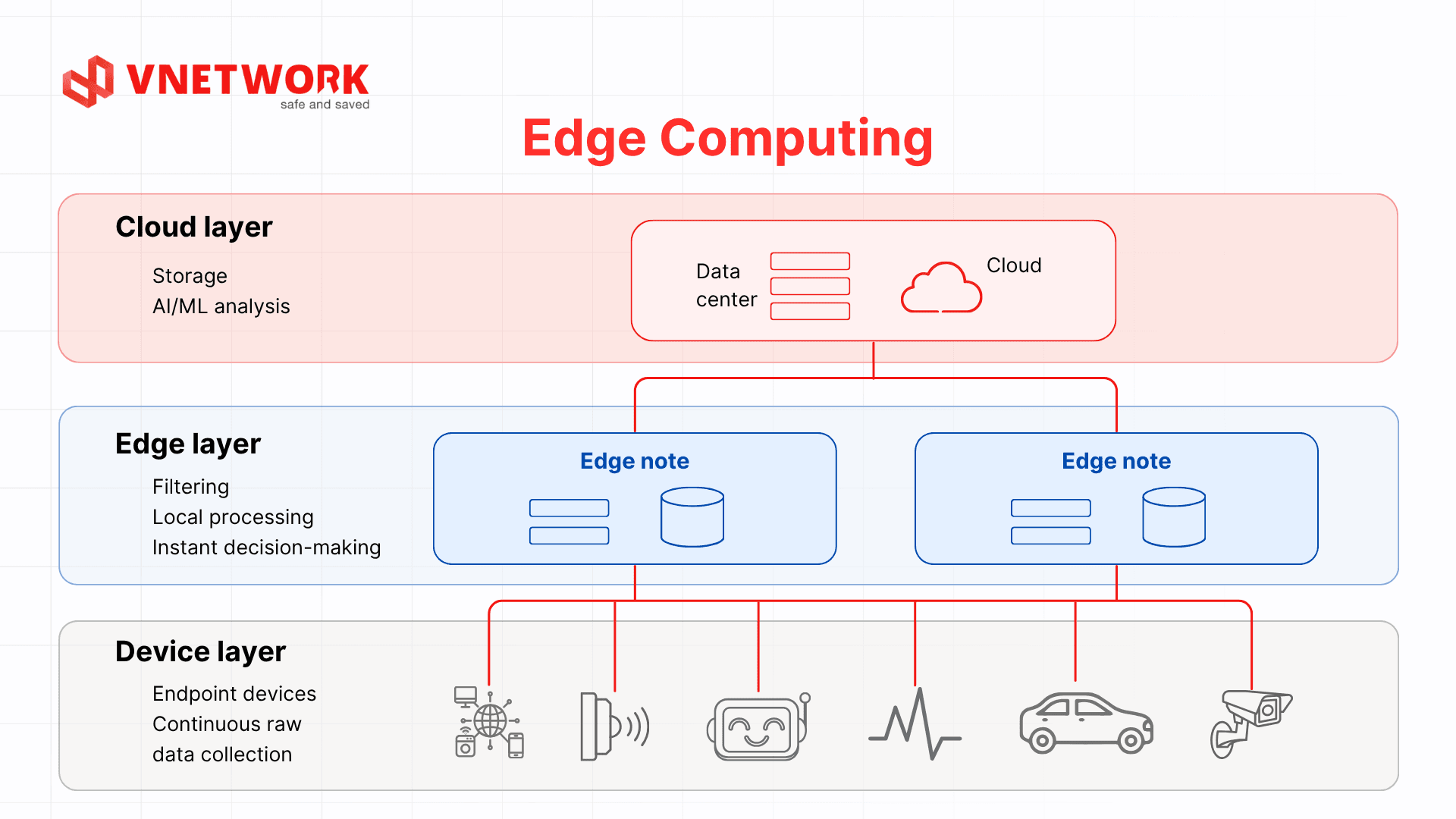 Device layer: Encompasses all end devices that generate data, including IoT sensors, security cameras, industrial machinery, connected vehicles, and wearable medical devices. At this layer, raw data is continuously collected and forwarded to the next layer for preliminary processing.