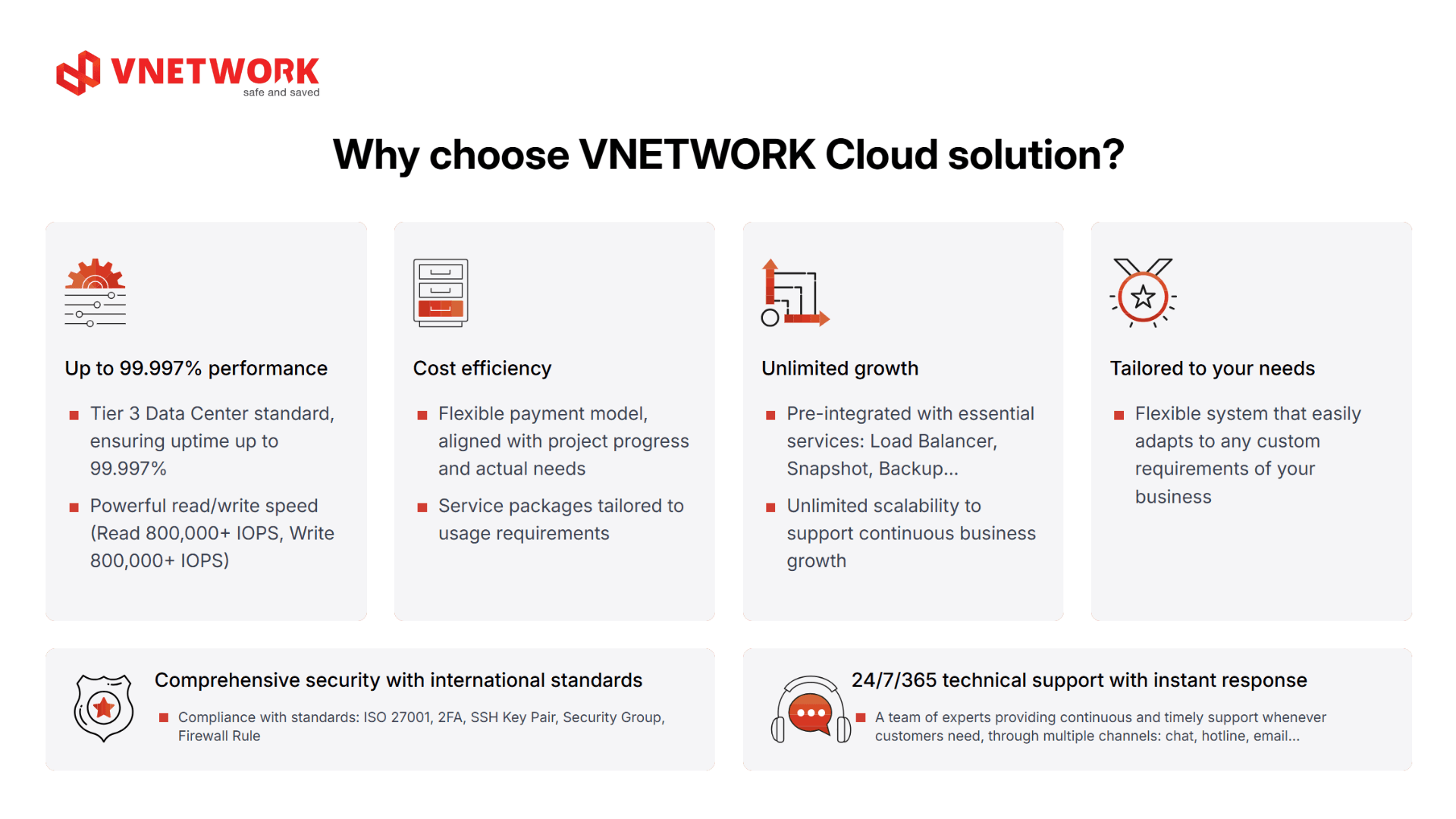VCLOUD is VNETWORK's cloud computing platform, built to meet the need for flexible, high-performance, and cost-efficient digital infrastructure for businesses of all sizes. Transparent pricing with no unexpected costs helps businesses manage budgets proactively even in volatile market conditions. From a legal standpoint, VCLOUD fully complies with the Personal Data Protection Law, operates on a data center certified to international Tier III standards, and guarantees uptime of up to 99.997%, making it suitable for high-traffic websites, e-commerce, and AI/Big Data systems.