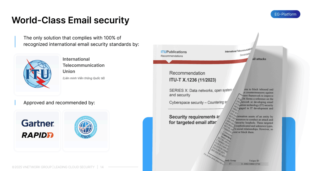 EG Platform is the only email security solution worldwide that fully complies with 100 percent of the ITU T X.1236 standards issued by the International Telecommunication Union. It is recommended by trusted organizations such as ITSCC, Gartner, and Rapid7. EG Platform provides comprehensive two way email protection for both inbound and outbound traffic, covering the full scope of international email security standards.