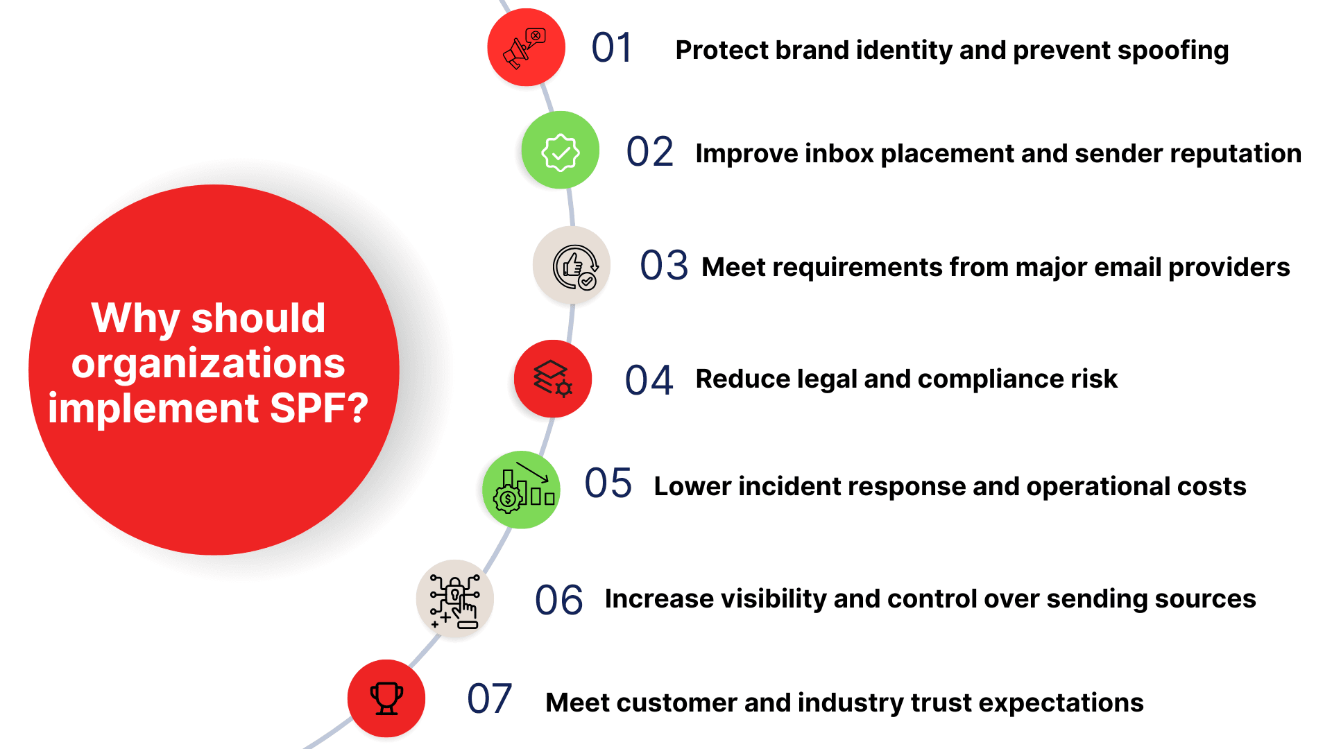 Many global email platforms now require SPF authentication as a baseline standard. Domains without SPF or with misconfigured records face increased risk of message blocking or spam filtering. This directly impacts sales communications, customer support, and internal operations. SPF is no longer optional but a mandatory standard for organizations that rely on email.