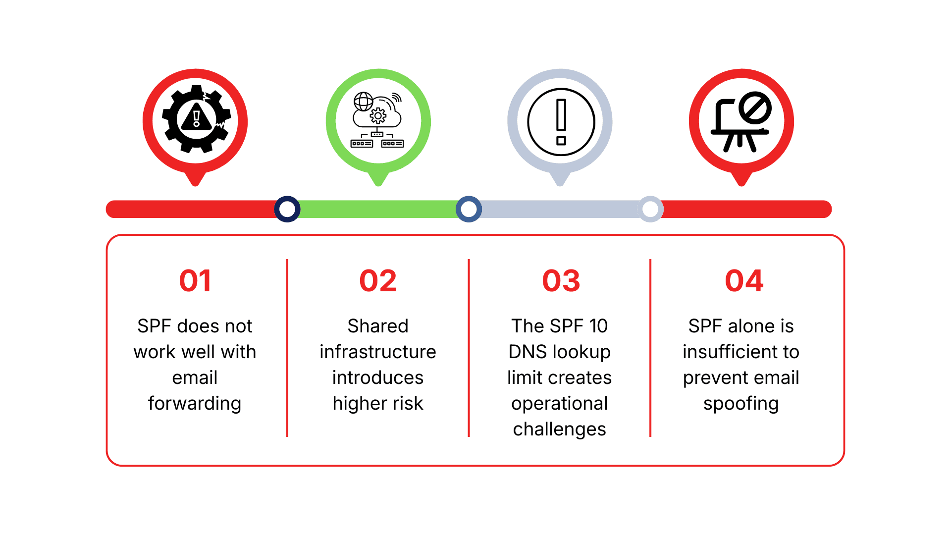 One of the most significant limitations of SPF is its inability to properly handle email forwarding. SPF validation is based on the IP address of the final sending mail server. When an email is forwarded through an intermediary system, the final sending IP no longer belongs to the original sender.