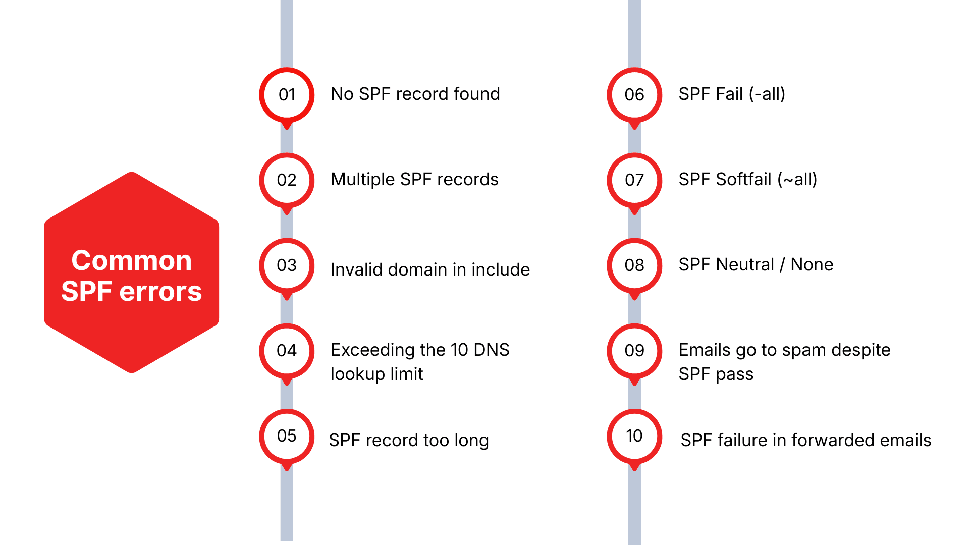 For example, include:_spf.google.com alone can generate up to four DNS lookups. As a result, organizations can easily exceed the 10 lookup limit, leading to SPF PermError, rejection of legitimate emails, increased spam filtering, or complete SPF failure.