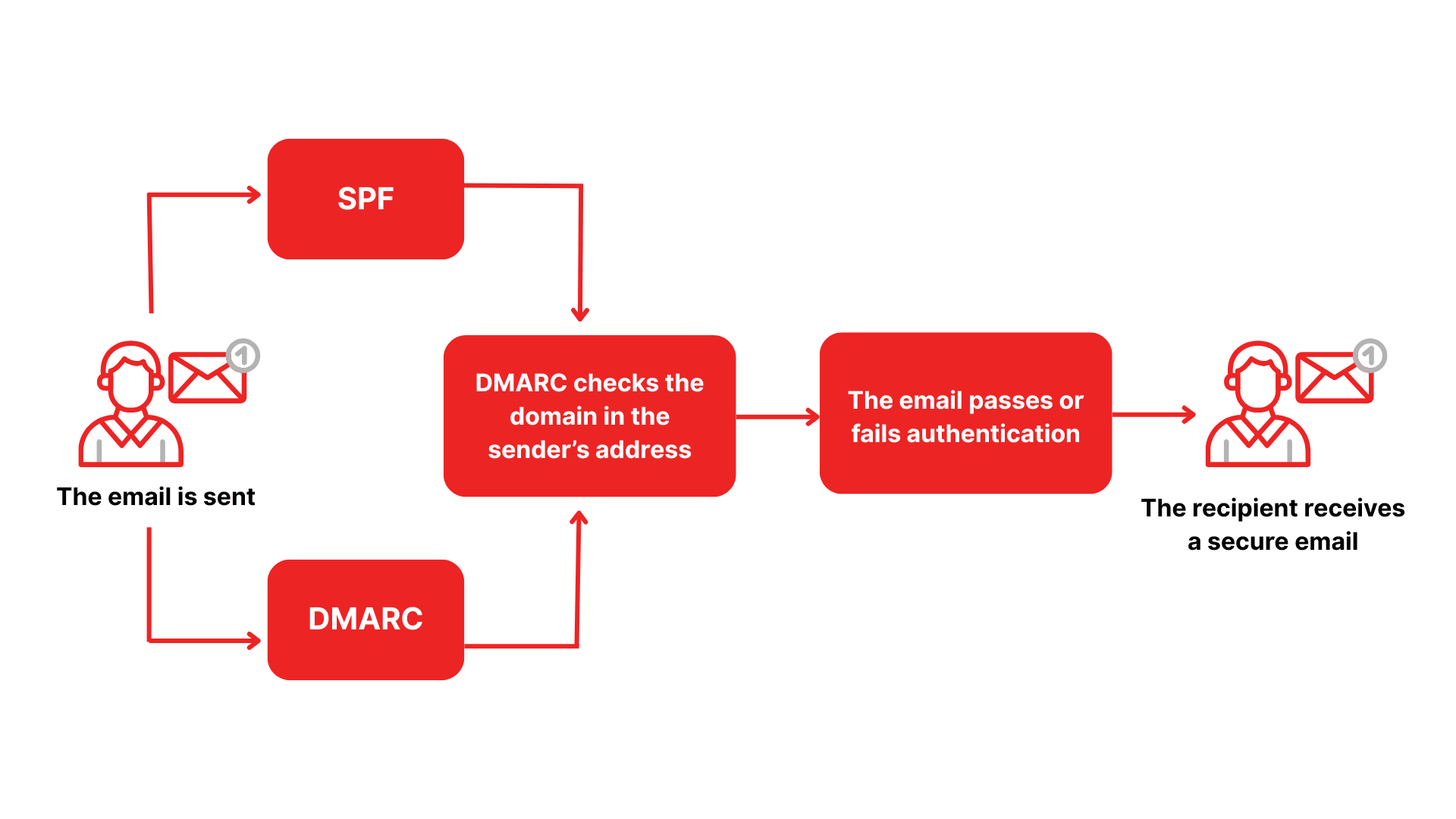 - DMARC enforces authentication policies and ensures alignment between SPF, DKIM, and the sending domain.
