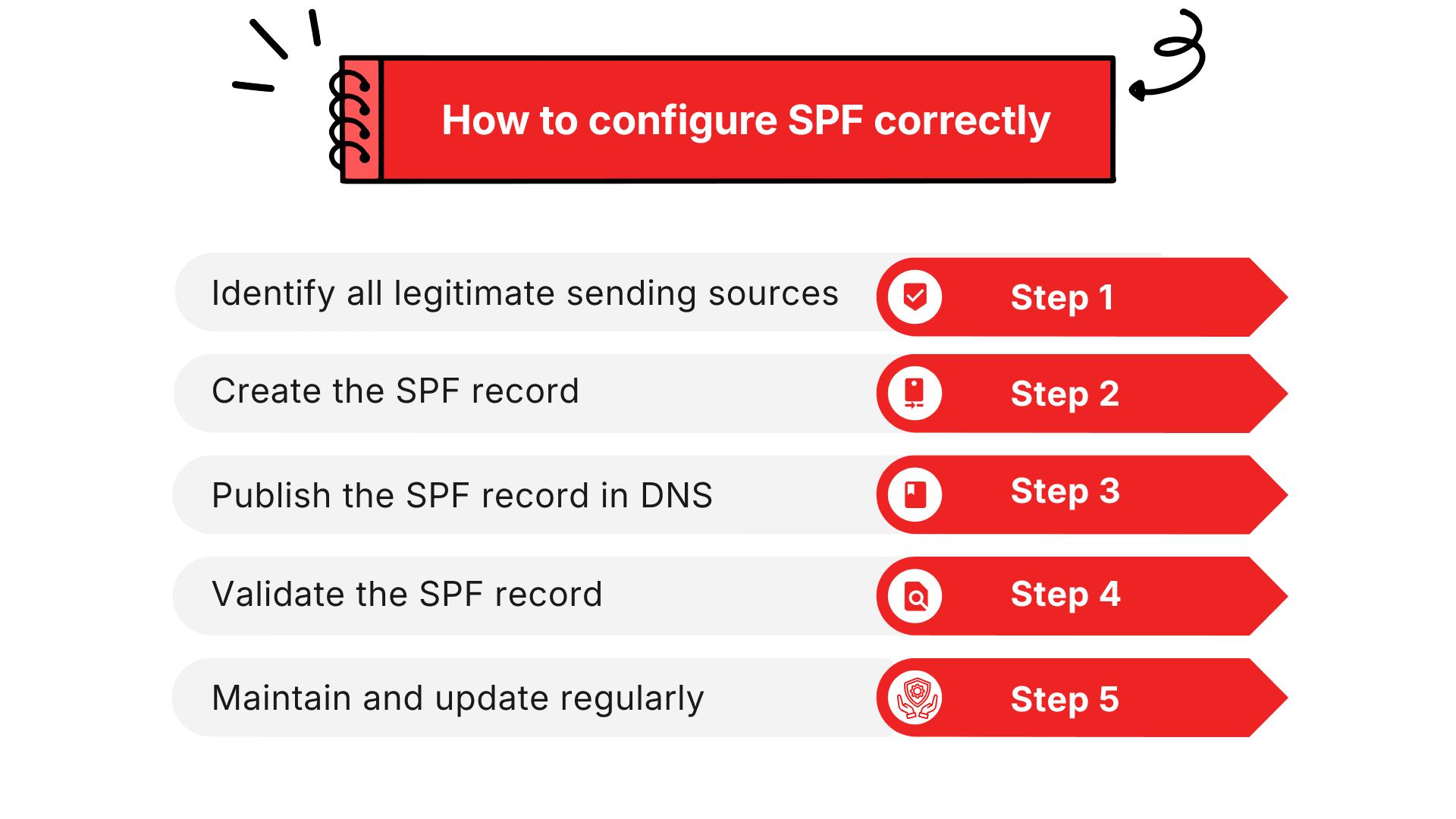 Update SPF whenever sending systems change. Ensure the record does not exceed the 10 DNS lookup limit. Perform periodic audits to prevent syntax errors or conflicts.