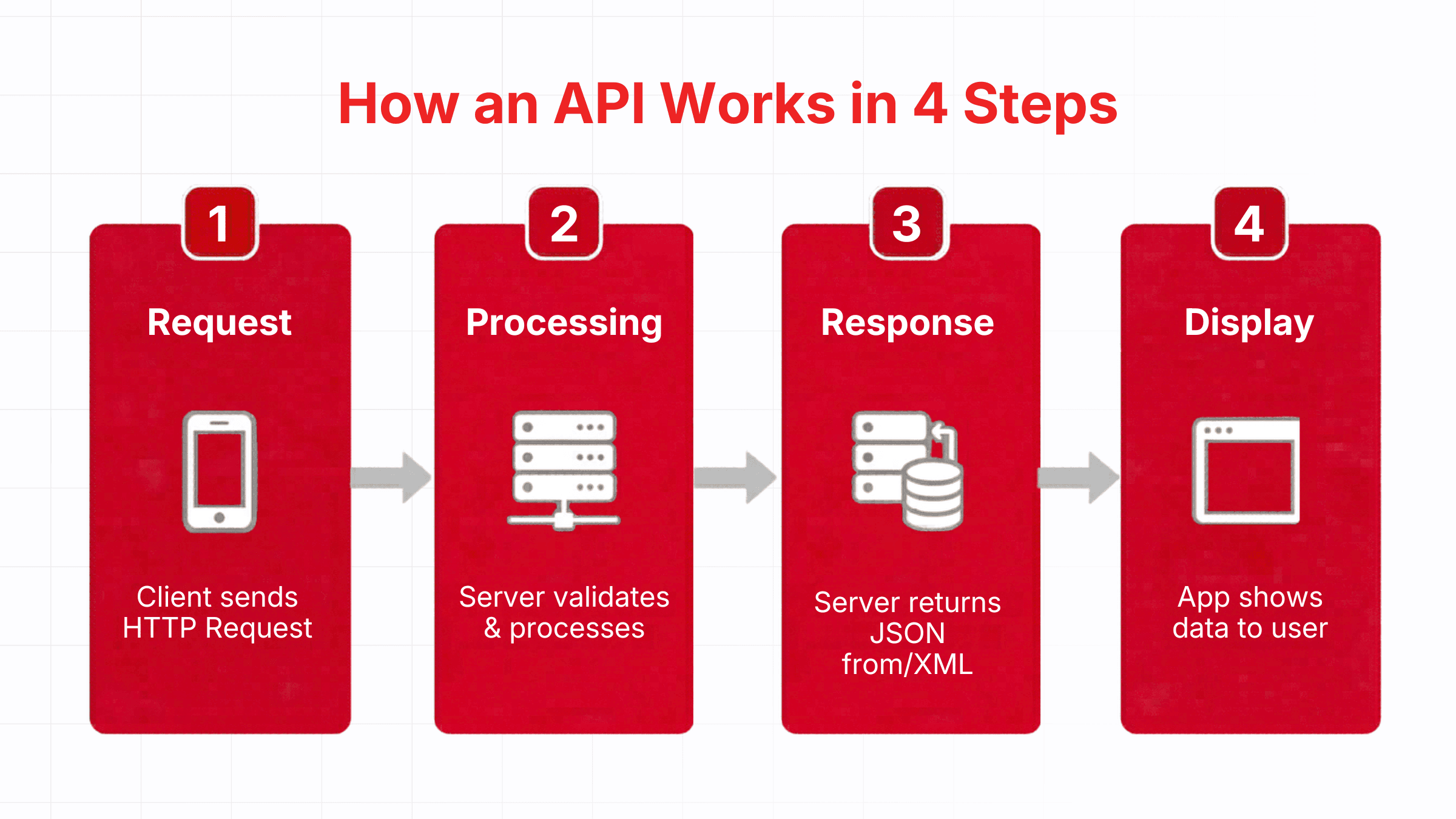 An API operates through a closed-loop process consisting of four steps, which execute automatically within milliseconds each time a user makes a request.