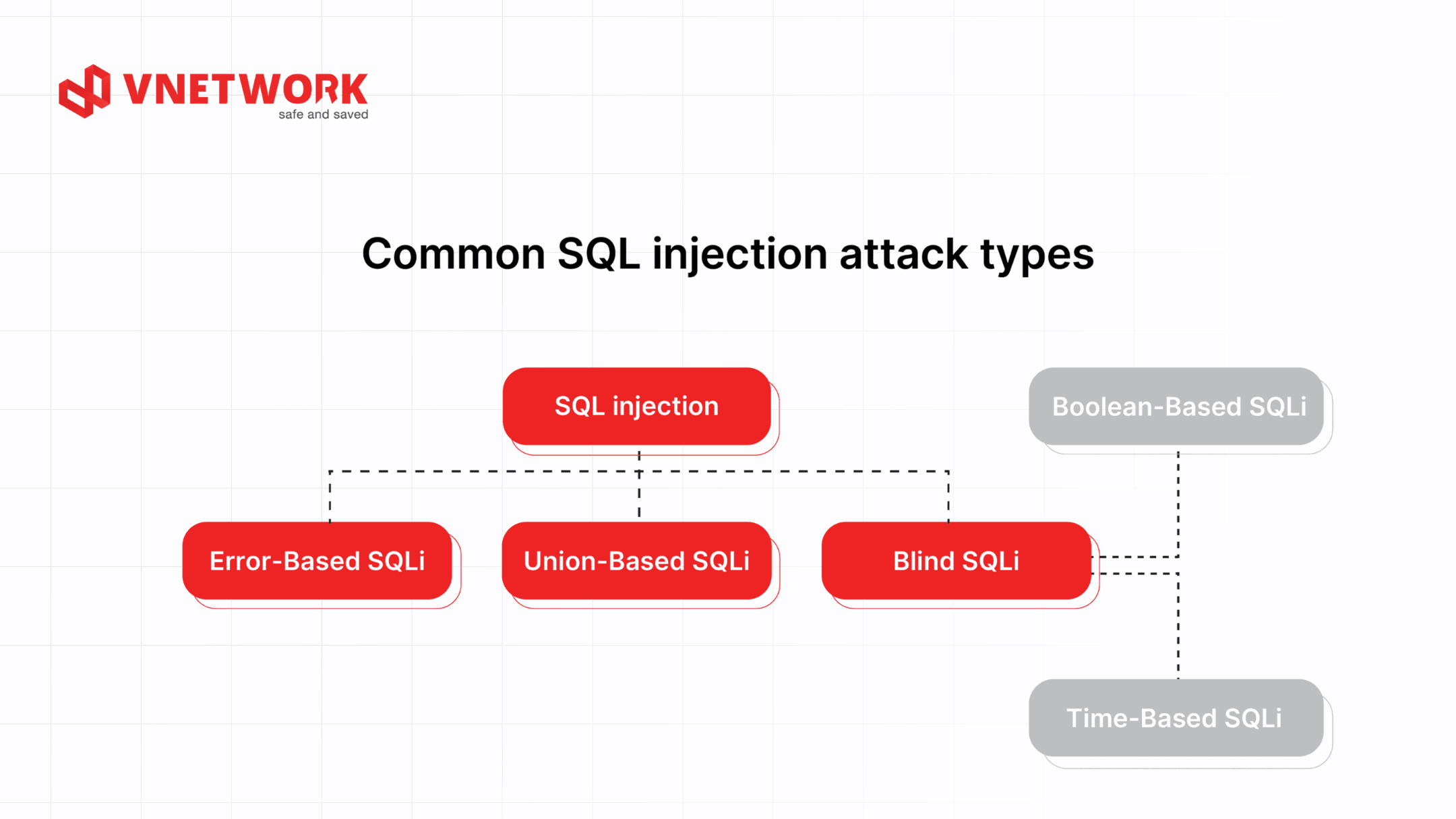 SQL injection attacks come in various forms, each with its own characteristics. Below are the three most common types of SQLi attacks.