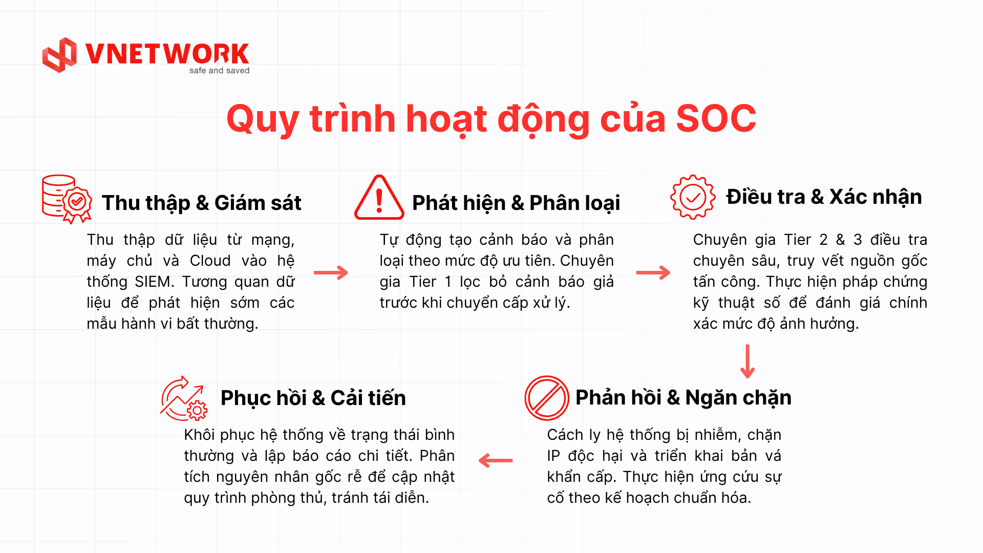 Security Operations Center hoạt động theo một quy trình liên tục gồm nhiều giai đoạn, từ thu thập dữ liệu đến phản hồi và cải tiến sau sự cố.