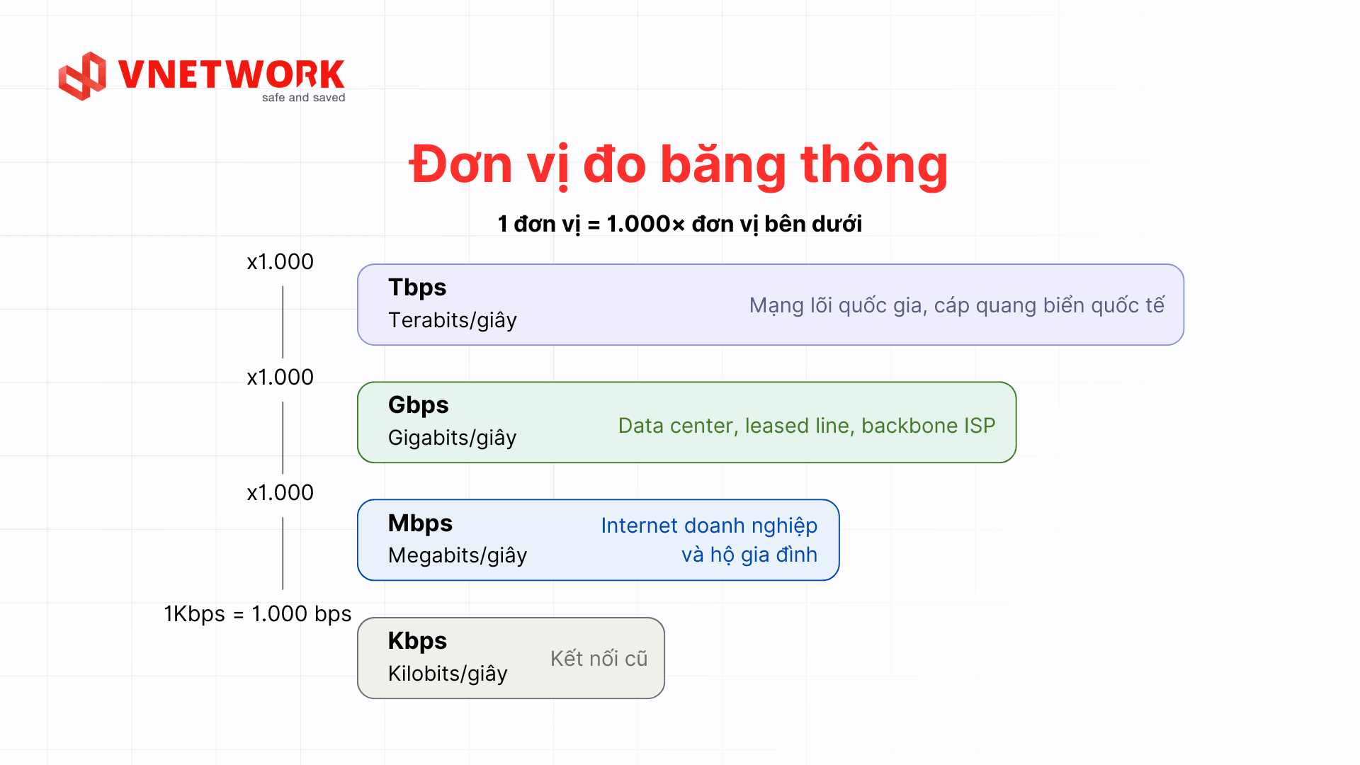 - Tbps (Terabits per second): tương đương 1.000 Gbps, áp dụng cho hạ tầng mạng lõi quy mô quốc gia và các tuyến cáp quang biển quốc tế.