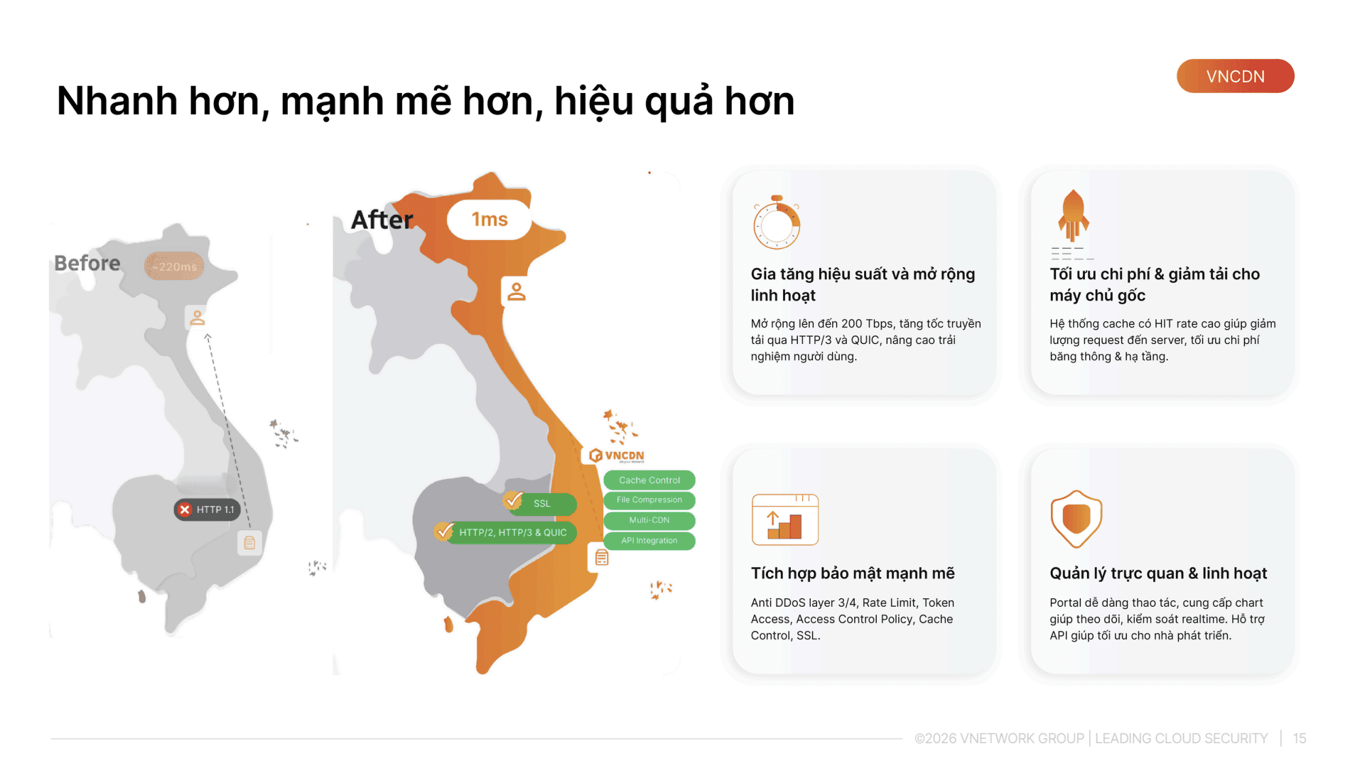 Đối với doanh nghiệp lớn có lưu lượng cao và yêu cầu uptime khắt khe, VNETWORK cung cấp VNCDN, giải pháp mạng phân phối nội dung được tối ưu đặc biệt cho thị trường Việt Nam và khu vực châu Á.