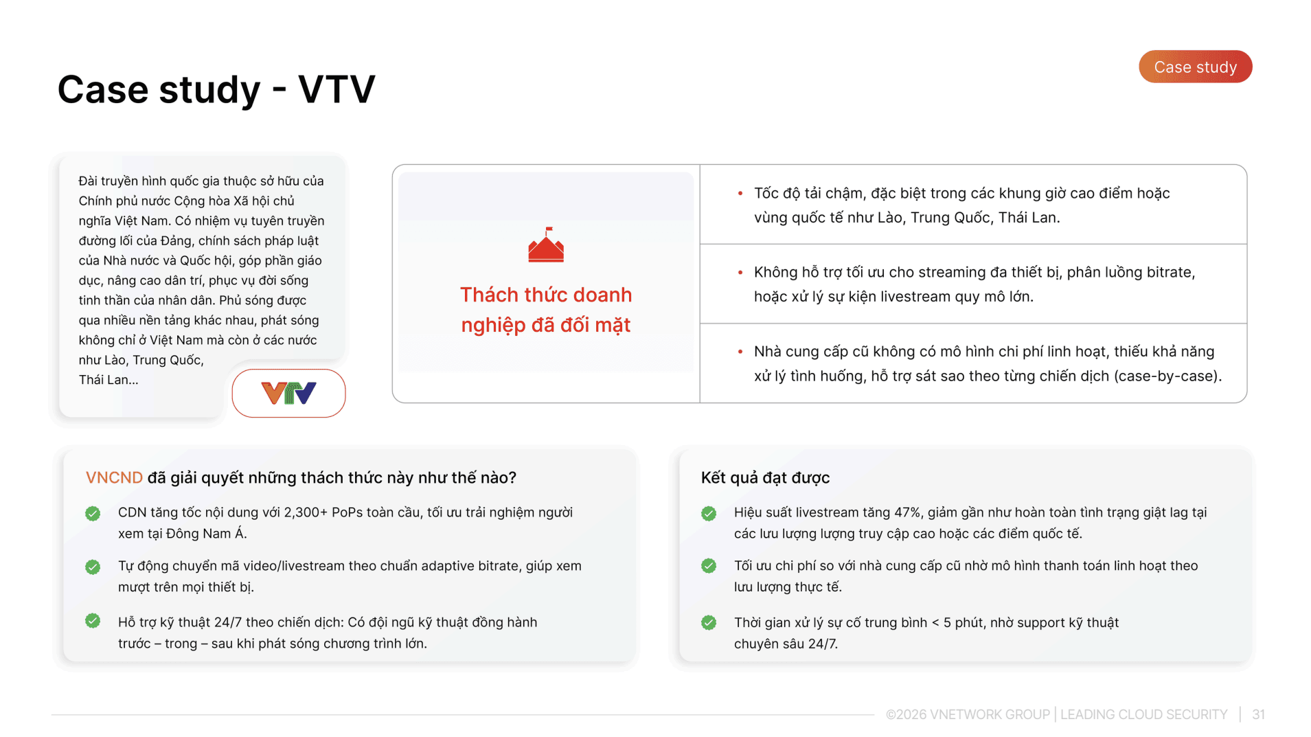 Kết quả sau triển khai, hiệu suất livestream tăng 47%, thời gian xử lý sự cố trung bình xuống dưới 5 phút nhờ hỗ trợ 24/7 theo từng chiến dịch phát sóng. Đỉnh điểm là sự kiện truyền hình trực tiếp lễ duyệt binh Quốc khánh 2/9, hàng triệu khán giả trên cả nước theo dõi xuyên suốt qua mọi thiết bị mà không một gián đoạn nào xảy ra.