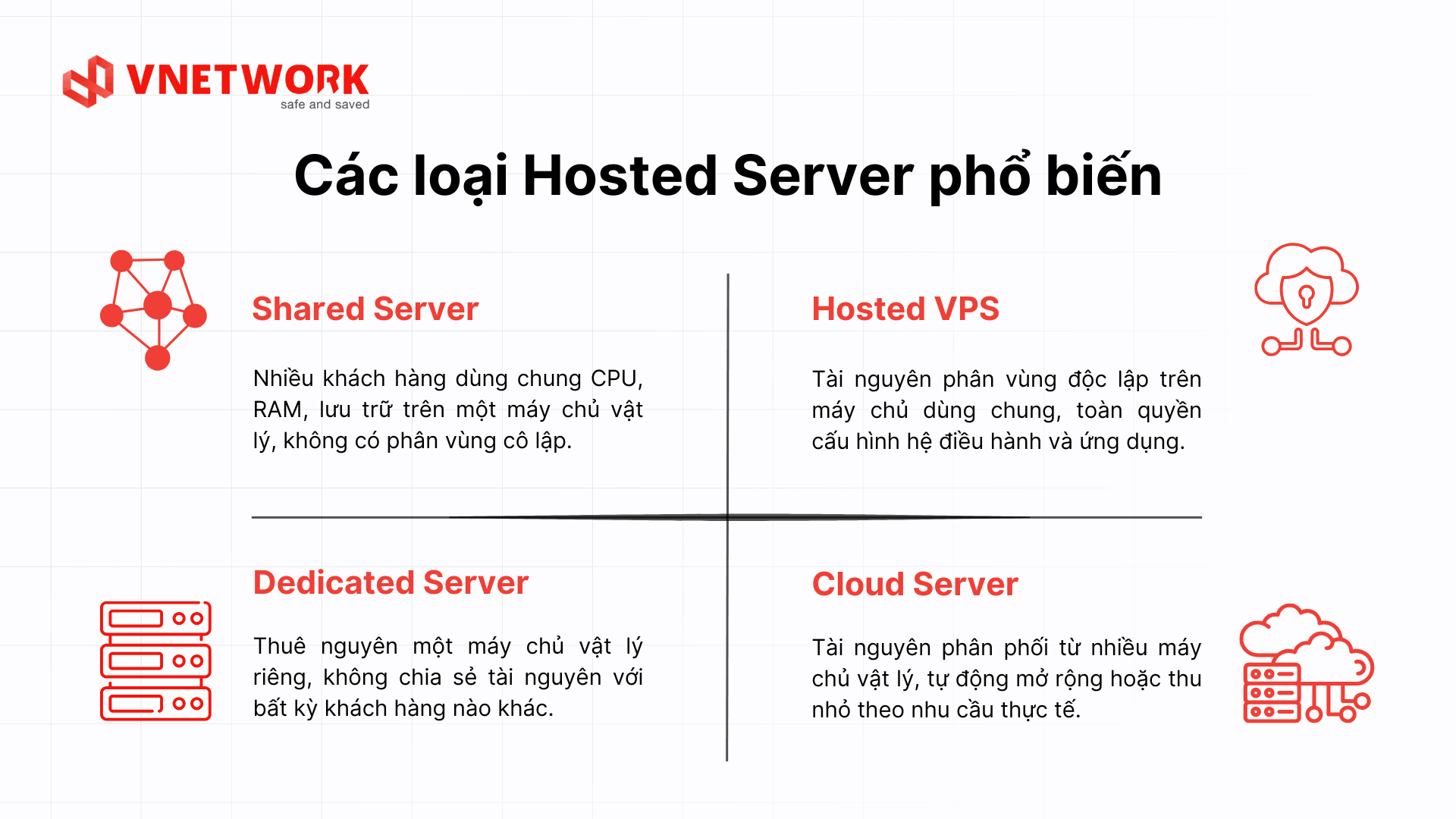Hosted server là lựa chọn chiến lược giúp doanh nghiệp xây dựng hạ tầng CNTT linh hoạt, tiết kiệm chi phí và sẵn sàng mở rộng mà không cần đầu tư phần cứng vật lý. Dù lựa chọn hosting dạng VPS, dedicated hay cloud server, yếu tố quyết định vẫn là chất lượng hạ tầng, năng lực bảo mật và uy tín của nhà cung cấp. VCLOUD của VNETWORK là giải pháp hosted server được phát triển đặc biệt cho thị trường Việt Nam, kết hợp hạ tầng chuẩn quốc tế, bảo mật đa tầng và hỗ trợ kỹ thuật 24/7. Liên hệ VNETWORK để được tư vấn giải pháp phù hợp với quy mô và ngành nghề của doanh nghiệp bạn.