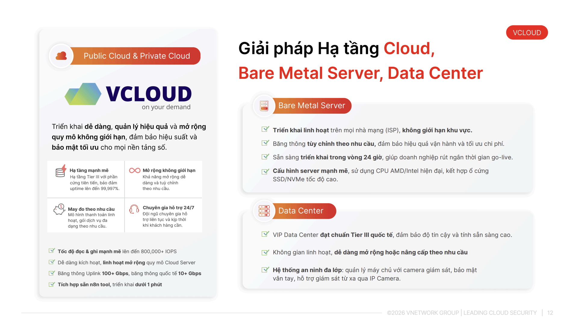 VCLOUD vận hành trên trung tâm dữ liệu đạt chuẩn Tier III với phần cứng tiên tiến, đảm bảo uptime lên đến 99,997%. Hệ thống lưu trữ hỗ trợ tốc độ đọc và ghi lên đến 800.000 IOPS, đáp ứng tốt các ứng dụng xử lý dữ liệu lớn, thương mại điện tử và AI. Băng thông Uplink đạt 100+ Gbps và băng thông quốc tế 10+ Gbps, đảm bảo kết nối ổn định và tốc độ cao cho mọi quy mô doanh nghiệp. Đội ngũ chuyên gia hỗ trợ 24/7, sẵn sàng xử lý kịp thời mọi sự cố phát sinh.