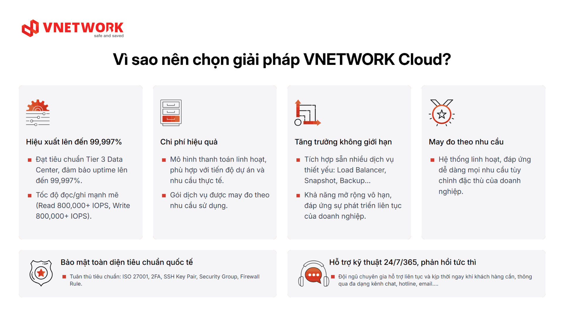 VCLOUD là nền tảng cloud computing của VNETWORK, được xây dựng để đáp ứng nhu cầu hạ tầng số linh hoạt, hiệu năng cao và chi phí tối ưu cho doanh nghiệp ở mọi quy mô. Mức phí minh bạch, không phát sinh bất ngờ, giúp doanh nghiệp chủ động ngân sách ngay cả khi thị trường biến động. Về mặt pháp lý, VCLOUD đáp ứng đầy đủ yêu cầu của Luật Bảo vệ Dữ liệu Cá nhân, vận hành trên data center đạt chuẩn Tier III quốc tế, cam kết uptime lên đến 99.997%, phù hợp cho website lưu lượng lớn, thương mại điện tử và hệ thống AI/Big Data.