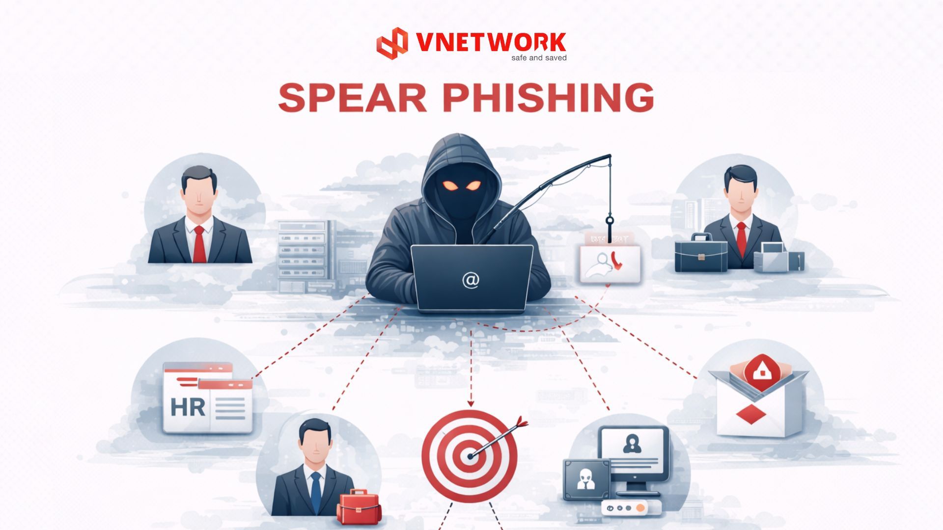 Spear Phishing là hình thức lừa đảo nhắm mục tiêu cụ thể, email được cá nhân hóa cao. Khác với phishing gửi hàng loạt, Spear Phishing giả mạo người quen hoặc tổ chức tin cậy, khiến nạn nhân rất khó nhận ra và dễ gây thiệt hại nghiêm trọng.
