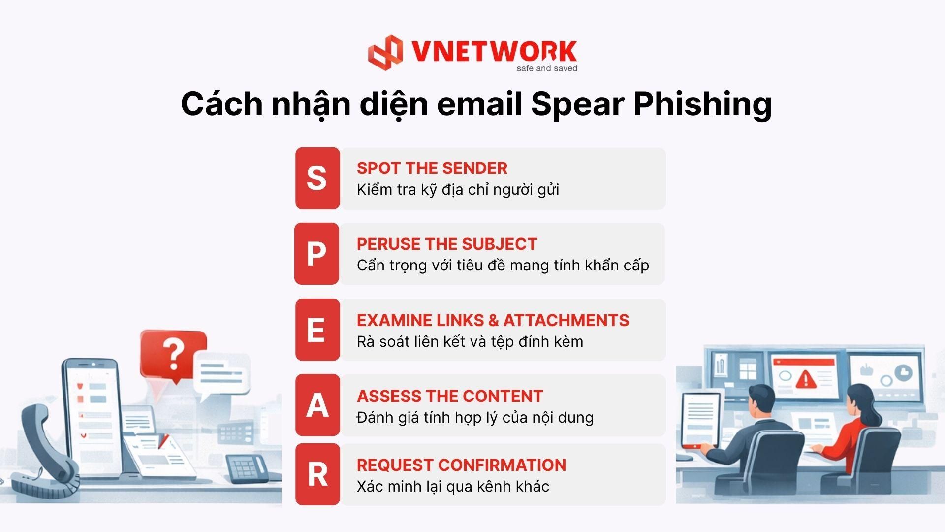 Do Spear Phishing được cá nhân hóa cao và thường ngụy trang dưới những email công việc quen thuộc, việc phát hiện không thể chỉ dựa vào cảm tính. Một cách hiệu quả là áp dụng phương pháp SPEAR, giúp người dùng kiểm tra email theo từng bước có hệ thống trước khi hành động.