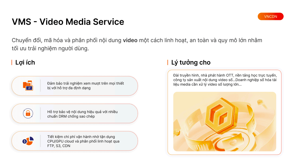 Để triển khai VOD hiệu quả, doanh nghiệp cần một nền tảng hạ tầng mạnh mẽ. Giải pháp VMS (Video Media Service) thuộc hệ sinh thái VNCDN của VNETWORK đáp ứng đầy đủ các yêu cầu này.