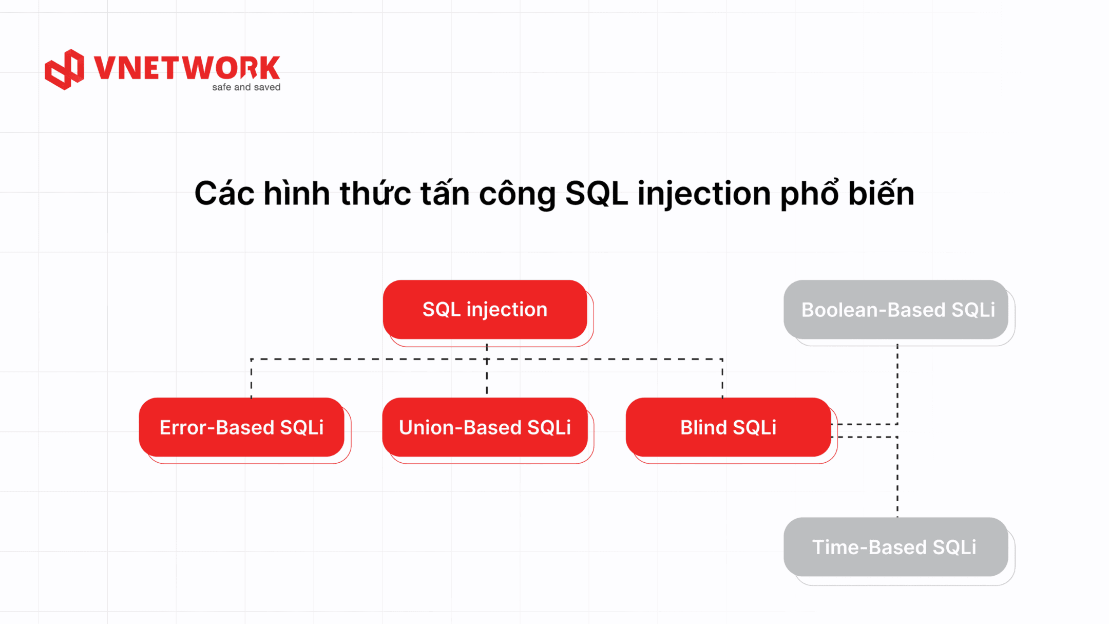 Các cuộc tấn công tiêm nhiễm SQL có nhiều loại khác nhau, mỗi loại có đặc điểm riêng. Dưới đây là 3 kiểu tấn công SQLi phổ biến nhất.